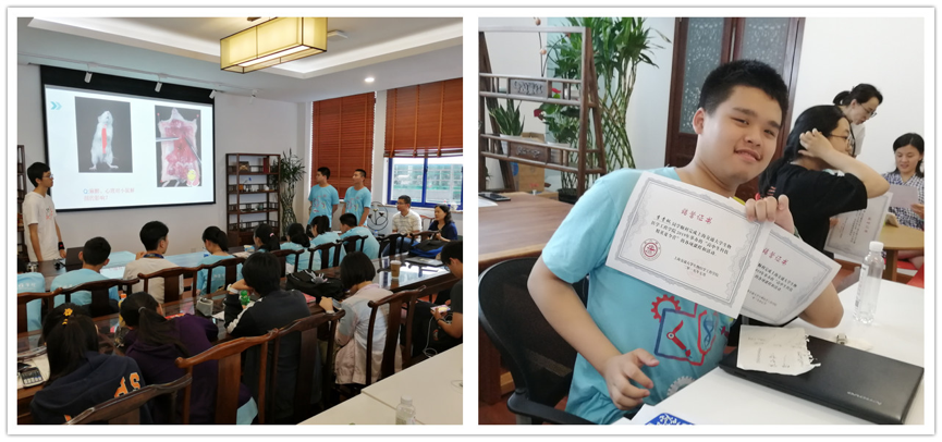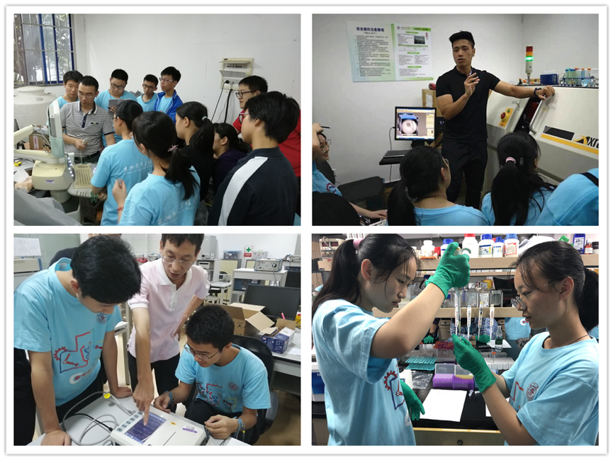 在为期五天的夏令营活动中,丰富多彩的课程让学生们全方位多角度与生物医学工程相关学科进行了亲密接触:参加了XCT显微镜原理讲座课程,并采集身边细小生物利用超高分辨的实验CT设备观察其内部精微的三维结构;聆听了小动物实验相关伦理知识讲座,观摩并动手实践了实验小白鼠的灌胃、尾静脉注射、脑血管病动物模型的制备等实验操作;亲手制备与临床检验相关的荧光磁性微球;学习超声成像设备的检测和治疗疾病的工作原理,并亲自用超声设备寻找自己的血管并检测血流速度;接触到组织工程与生物材料相关前沿学科,制备水凝胶颗粒,并且领略了生物3D打印机是如何参与构建人体组织的先进技术;通过学习医学嵌入式技术,了解到心电图,血氧指数等医学常见指标是如何形成及其含义,并亲手操作了血氧仪、心电图设备等。