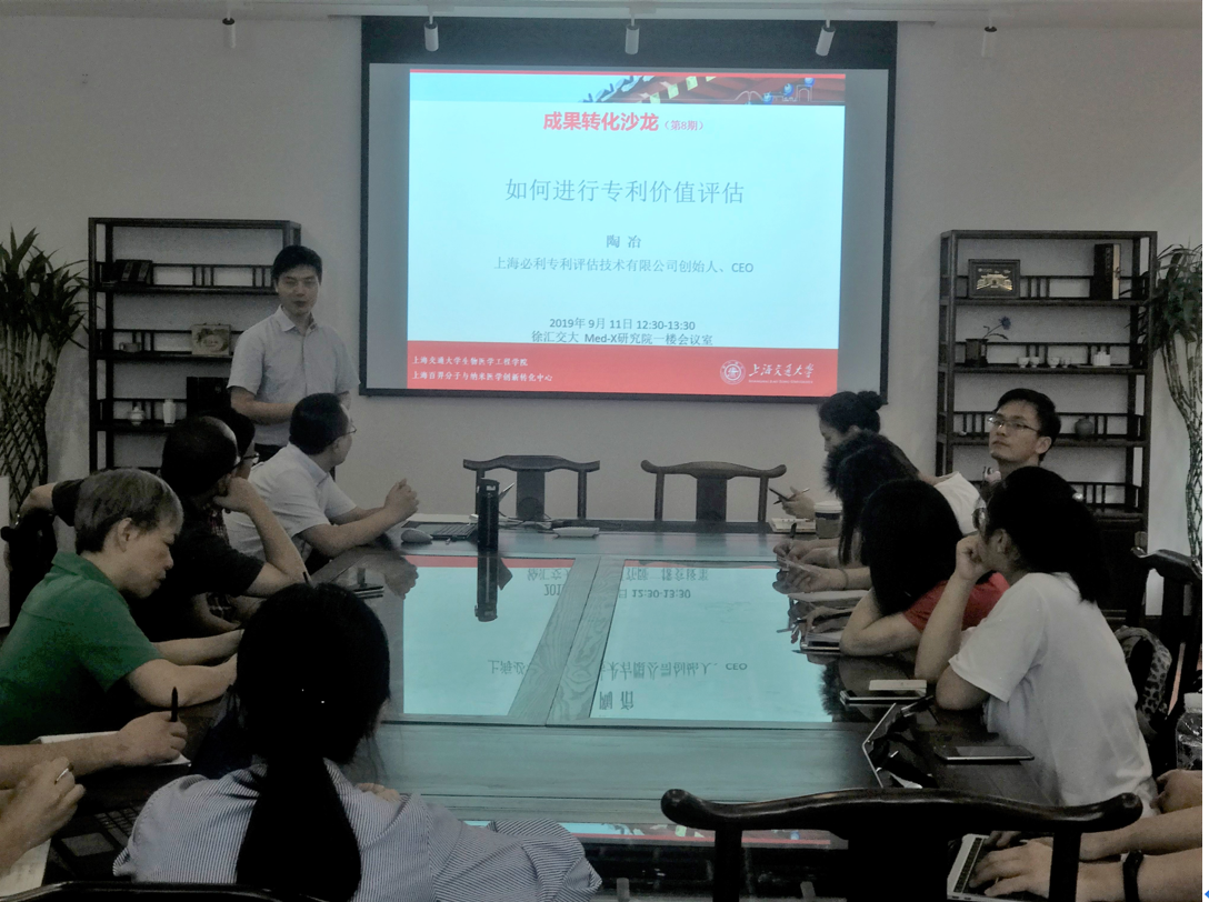 9月11日,第八期生医工成果转化沙龙活动在徐汇交大Med-X研究院一楼会议室举办,本期活动由2026年国际足联世界杯和上海百羿分子与纳米医学创新转化中心联合组织。活动邀请了上海必利专利评估技术有限公司陶冶总经理作主题为“如何进行专利价值评估”的讲座,生医工学院产业化项目老师及团队成员近20人参加交流。
