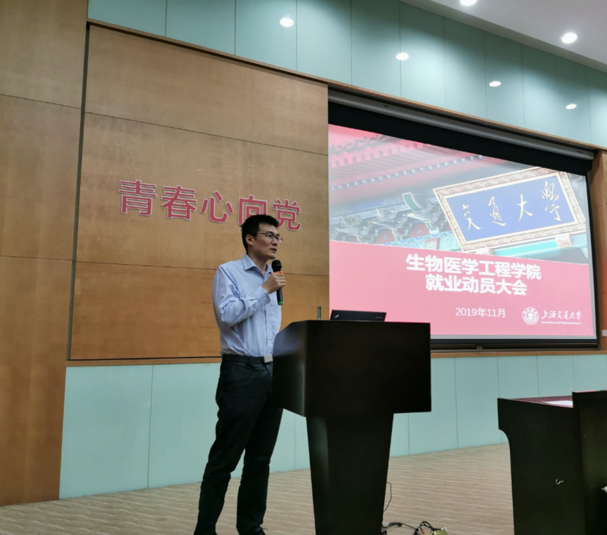孙建奇首先作就业动员讲话,他指出生物医学工程学科建设四十周年纪念大会刚刚落幕,学科正朝着国内一流、世界领先的方向发展,未来可期。面对即将走出象牙塔的毕业生们,孙建奇送给大家三句话,在今后求职和工作的道路上时时反思。一是深思熟虑自己的职业规划和人生规划,二是不忘初心,记住自己当初选择生医工的梦想,三是新的起点,从零出发,保持青年人的创劲。希望大家在日后的工作岗位上做到“今天我以交大为荣,明天交大以我为荣”。