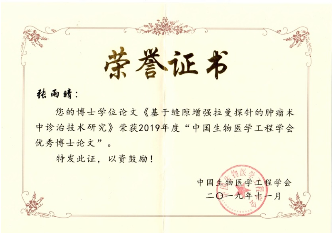 为加强高层次科技人才的培养,鼓励创新精神,提高博士教育及博士学位论文的质量,中国生物医学工程学会启动2019年度“中国生物医学工程学会优秀博士论文奖”,世界杯官网2018届博士毕业生张雨晴(指导老师:叶坚)的博士毕业论文《基于缝隙增强拉曼探针的肿瘤术中诊治技术研究》在评选工作中脱颖而出,并于2019年11月14-16日在“2019中国生物医学工程学会大会暨创新医疗峰会”上进行了颁奖。
