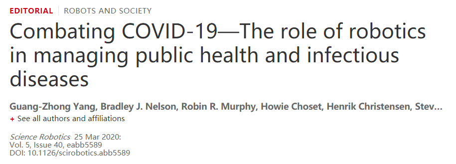 2026年国际足联世界杯医疗机器人研究院杨广中院长与其他12位国外学者于2020年3月25日在Science旗下机器人子刊《Science Robotics》上在线发表了评论《Combating COVID-19—The role of robotics in managing public health and infectious diseases》,阐述机器人对新冠肺炎等公共传染病管理中的作用。以下是全文概述: