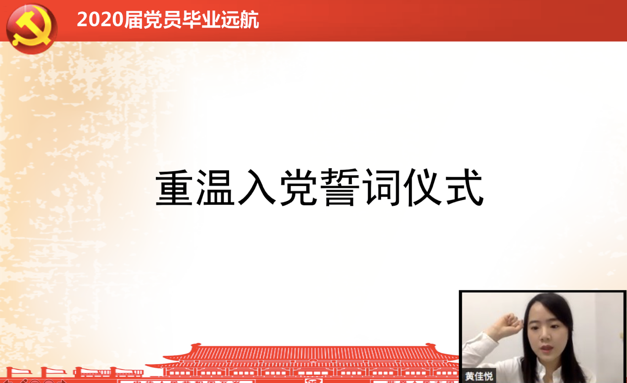 最后,由黄佳悦同志带头领誓,带领所有毕业生党员重温入党誓词,在庄严的宣誓声中,本次远航教育活动圆满落幕。