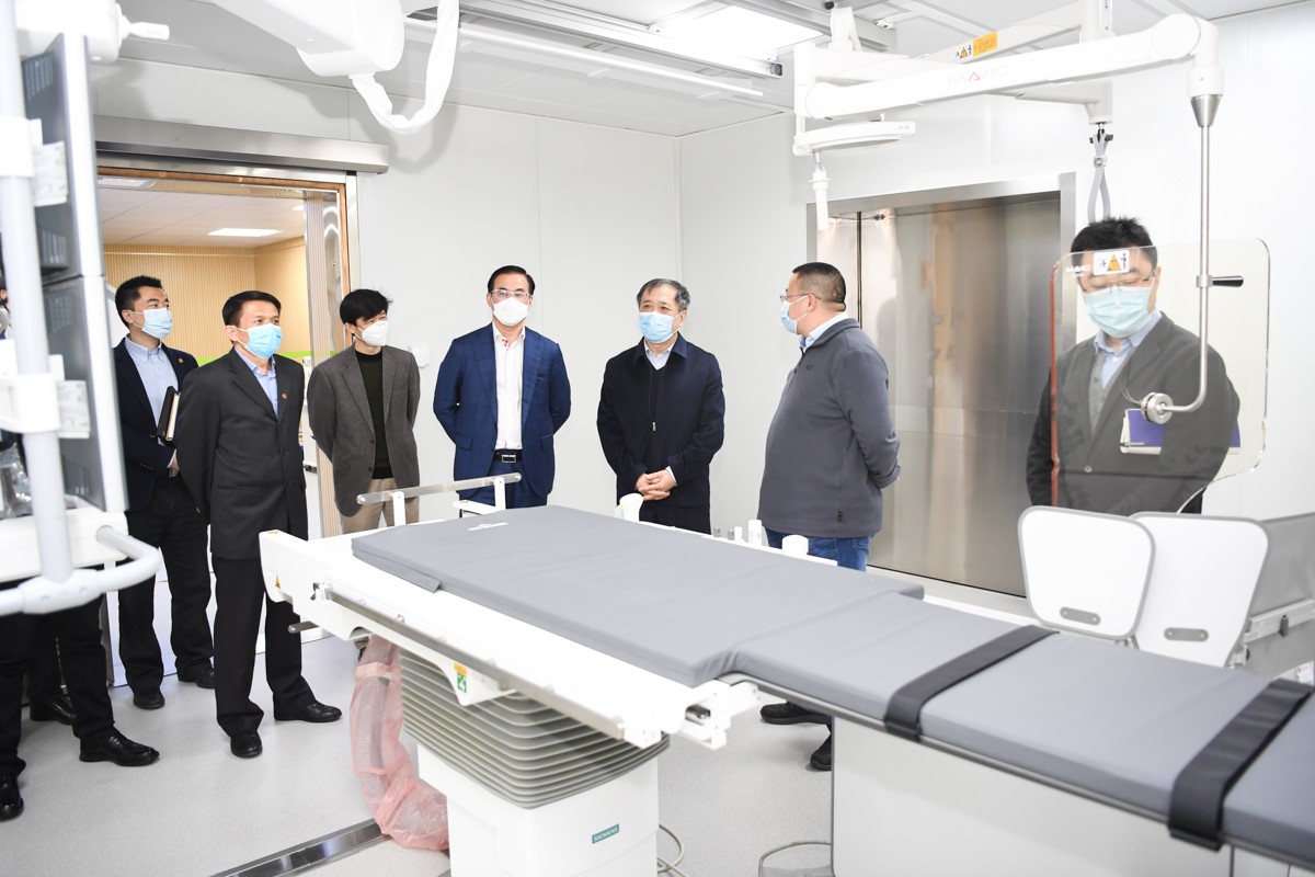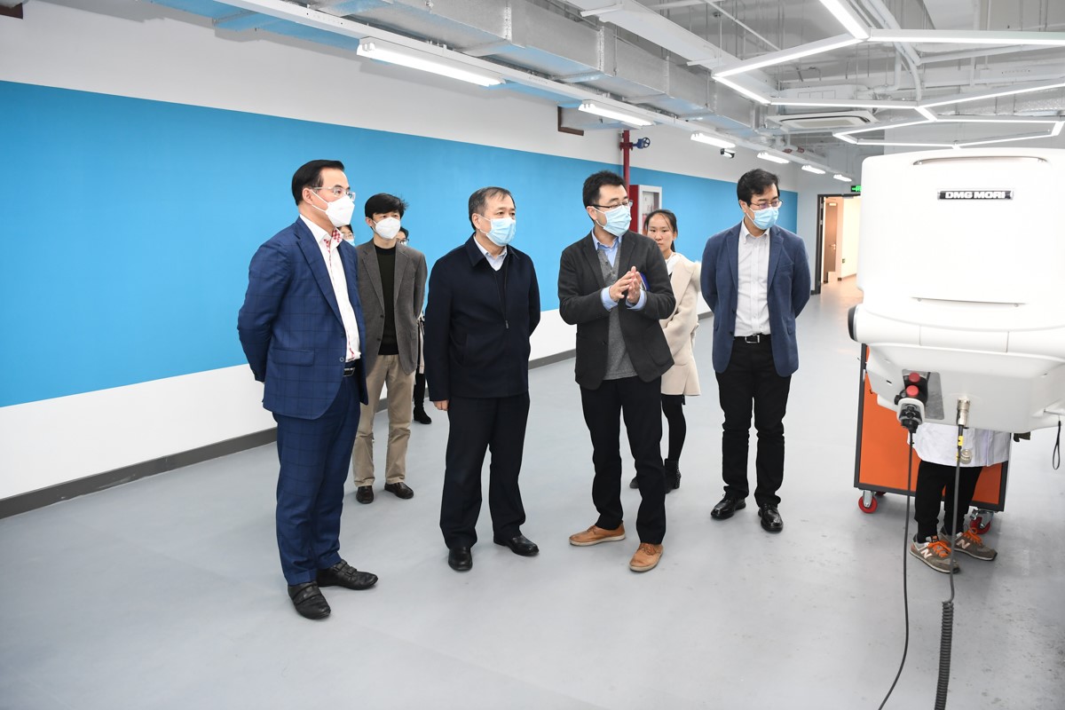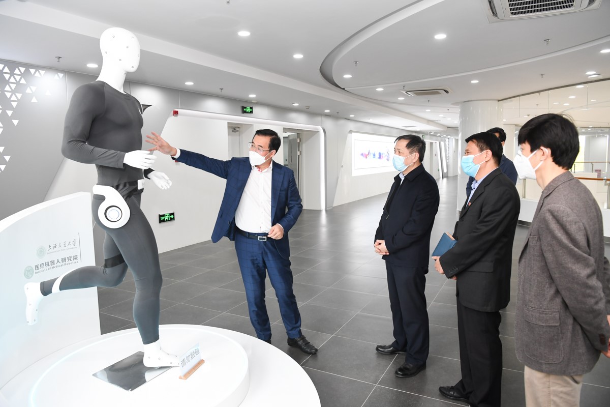 杨振斌实地考察了位于剑川路930号的医疗机器人研究院产业园和位于校内的研究院二期实验室、精密仪器制造平台和医疗影像平台。医疗机器人研究院院长杨广中院士和团队项目负责人介绍了心血管介入手术机器人、柔性臂内窥镜手术机器人、肺腹腔肿瘤穿刺手术机器人及成像机器人平台等相关项目。