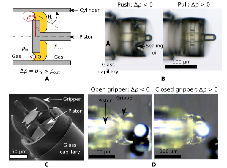 为了提供数百微米规模的驱动力,该论文提出了气动驱动力和表面张力的组合来驱动活塞,该微型活塞连接到直径为140 μm的毛细血管末端,采用滴油法将活塞和气缸密封隔开,以防止185 mbar压强差以下的任何泄漏,同时在运转部件之间润滑摩擦,活塞产生的力在压力高达130 μN时线性增加,且不会破坏液封。此微型活塞最大直径为150 μm,通过双光子打印制备而成,实验证明这种微型活塞结合微型夹具(如图1所示),可抓握、移动并释放50 μm微球 (如图2 所示)。此项研究为微米级导管驱动开辟了崭新的道路。