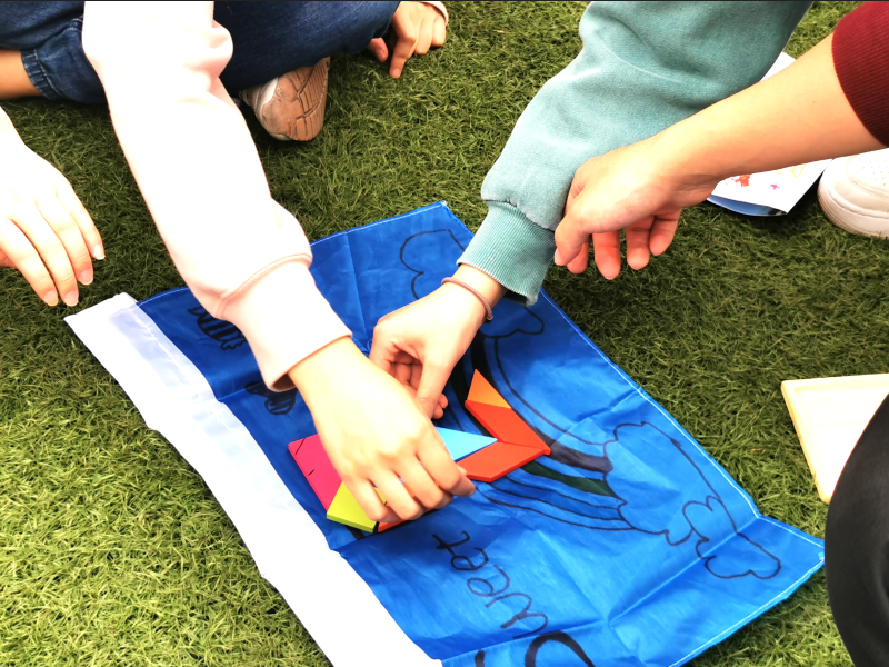 在“七巧板”活动中,同学们通过和其他组的同学进行沟通、协作,换取到他组的七巧板碎片完成自己小组的特定任务。在沟通的过程中,组内同学凝聚在队长指挥下“各显神通”,共同为团队目标出谋划策。