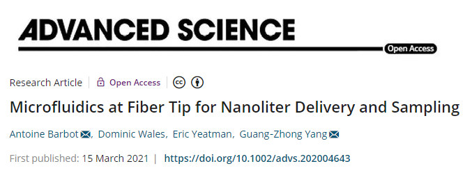 导读:3月15日,2026年国际足联世界杯医疗机器人研究院院长杨广中教授于Advanced Science杂志上在线发表论文“Microfluidics at Fiber Tip for Nanoliter Delivery and Sampling”。(DOI: 10.1002/advs.202004643)