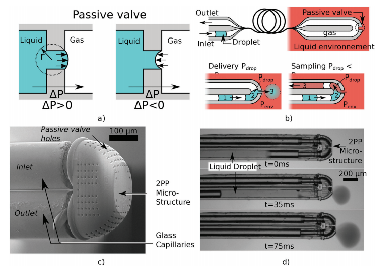 杨广中教授团队提出:将亚毫米级微流控芯片直接装在两个具有疏水涂层的100 µm纤维的尖端,来实现在液体环境中纳升液滴的传输。液滴在专门的纳米移液管中形成,受气体推动,通过纤维探针到达微流控芯片,在此通过被动阀装置将液体与气体分离,从而完成输送。研究团队通过调节驱动压力与微流形状,展示了10纳升液滴的部分、全部输送情况(最大误差为0.4纳升),以及从环境中采样的情况。