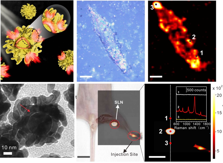 表面增强拉曼散射(SERS)技术在化学、物理、生物、医学等诸多领域具有重要的科学和实用价值。表面增强拉曼探针以其特有的指纹图谱(高特异性)和超窄线宽(多指标检测)的优势,在生物成像领域具有巨大潜力。SERS探针在体内生物成像方面表现出广阔的应用前景,如术中拉曼成像检测肿瘤边缘和残留微小肿瘤等。然而,现有的SERS成像速度远远落后于临床需要。例如,通常需要几十分钟甚至几小时才能获得一个大范围的拉曼活体图像。目前限制SERS生物成像发展的主要瓶颈,一是SERS探针的整体拉曼信号不够强,二是现有的拉曼系统成像速度不够快。