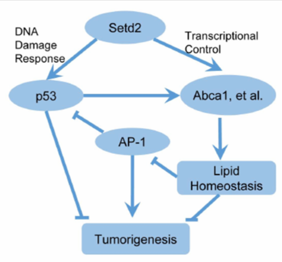 进一步研究表明,Setd2不仅通过调节DNA损伤反应抑制HCC,而且通过调节肝脏脂质代谢来抑制HCC。Setd2缺乏可下调H3K36me3胆固醇外流基因的富集和表达,引起脂质积聚。高脂饮食促进Setd2基因缺陷小鼠脂质积累,促进肝癌的发生。ChIP-Seq分析显示,Setd2缺失可诱导肝脏c-Jun/AP-1激活,这是由脂质累积引起的。c-Jun作为HCC的癌基因,通过抑制Setd2缺陷细胞中的p53发挥作用。本研究首次揭示了Setd2在肝癌中的作用,揭示了其调节胆固醇稳态和c-Jun/AP1信号转导的机制,深入了对其病理机制的认识,为肝癌靶向治疗提供了新的理论依据。