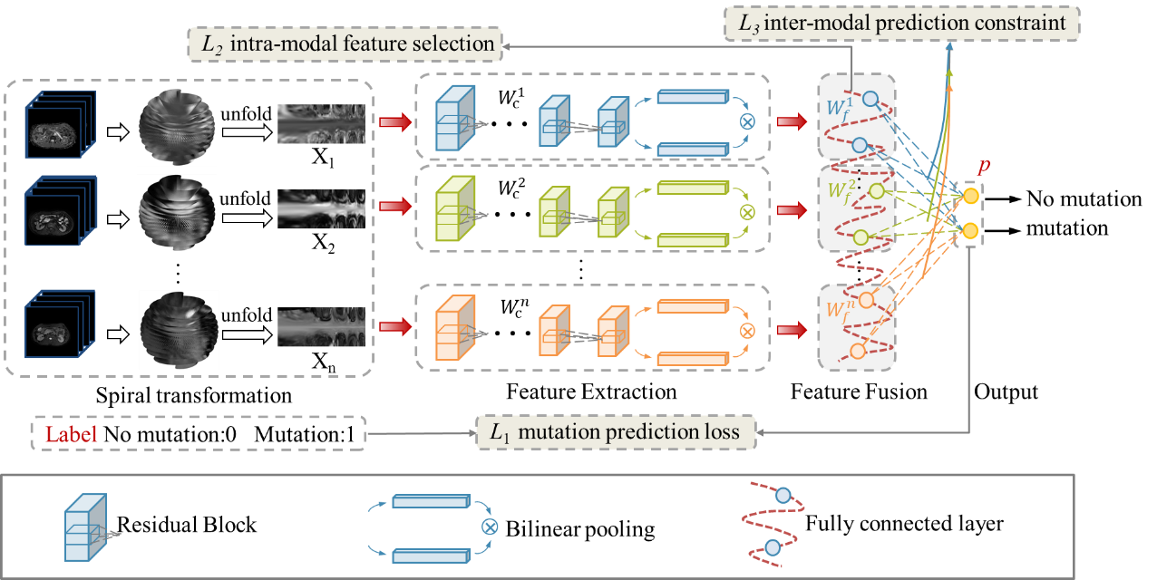 因此,钱晓华课题组开发了基于多模态MRI的胰腺癌TP53状态预测模型(图1),致力于对胰腺癌患者的无创评估。具体来说,1) 该模型结合螺旋变换算法,将三维数据转化到二维空间,最大程度地保留了空间上特征的相关性,并为后续基因突变预测节省了大量的计算资源;并且,螺旋变换算法可用于数据的有效扩增。2)构建了模型和数据混合驱动的多模态深度学习模型,引入了先验知识构建模型驱动的约束项,充分利用模态间信息的相关性和多样性,实现各模态内特征的稀疏化和模态间预测结果的均衡化,有效提高多模态的融合效果。