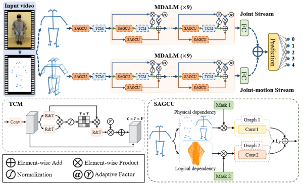 因此,作者开发了稀疏化自适应的图卷积网络模型实现基于视频的腿部灵活性任务的自动化评估。具体来说,1)通过先进的人体姿态估计模型从视频中提取PD患者的关节点序列;2)提出了稀疏化自适应图卷积单元(SAGCU),以实现视频中人体骨架序列的空间建模,对人体的物理和逻辑依赖性进行了自适应编码,然后将稀疏化策略的约束嵌入到成本函数中以挖掘判别性特征,最终挖掘出了腿部灵活性任务中最重要的空间结构关系;3)引入了时间上下文模块(TCM),通过计算时间位置的相关性来构造视频序列的上下文依赖关系,捕获了腿部灵活性任务执行过程中关节的全局变化;4)开发了多域注意力学习模块(MDALM),高级时空特征用于引导低级特征以增强通道域中的显著性特征,最终实现了时间、空间和通道域的特征集成。