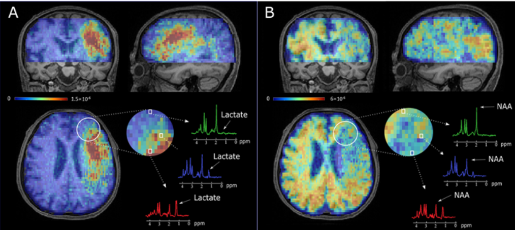 脑代谢改变是急性卒中脑组织损伤的重要特征,磁共振波谱成像技术(MRSI)可以实现无创在体脑代谢成像。但由于采集时间长、空间分辨率差、覆盖范围窄等不足,MRSI目前在临床上应用受到极大限制。李瑶课题组与美国UIUC的Zhi-Pei Liang教授团队积极合作,首次实现了SPICE(SPectroscopic Imaging by exploiting spatiospectral CorrElation)技术的脑卒中临床转化,在8分钟内即可获得空间分辨率为2 *3 *3mm3的N-乙酰天冬氨酸(NAA)和乳酸(Lactate)等重要神经代谢物的同步3D全脑影像,并对急性脑卒中缺血半暗带进行有效区分。该成果表明SPICE提供的神经代谢影像信息比传统的血流灌注成像对卒中后缺血组织的损伤程度提供更精准的判定,为进一步探究快速高分辨率磁共振代谢成像在急性脑卒中的临床应用提供了重要支持。
