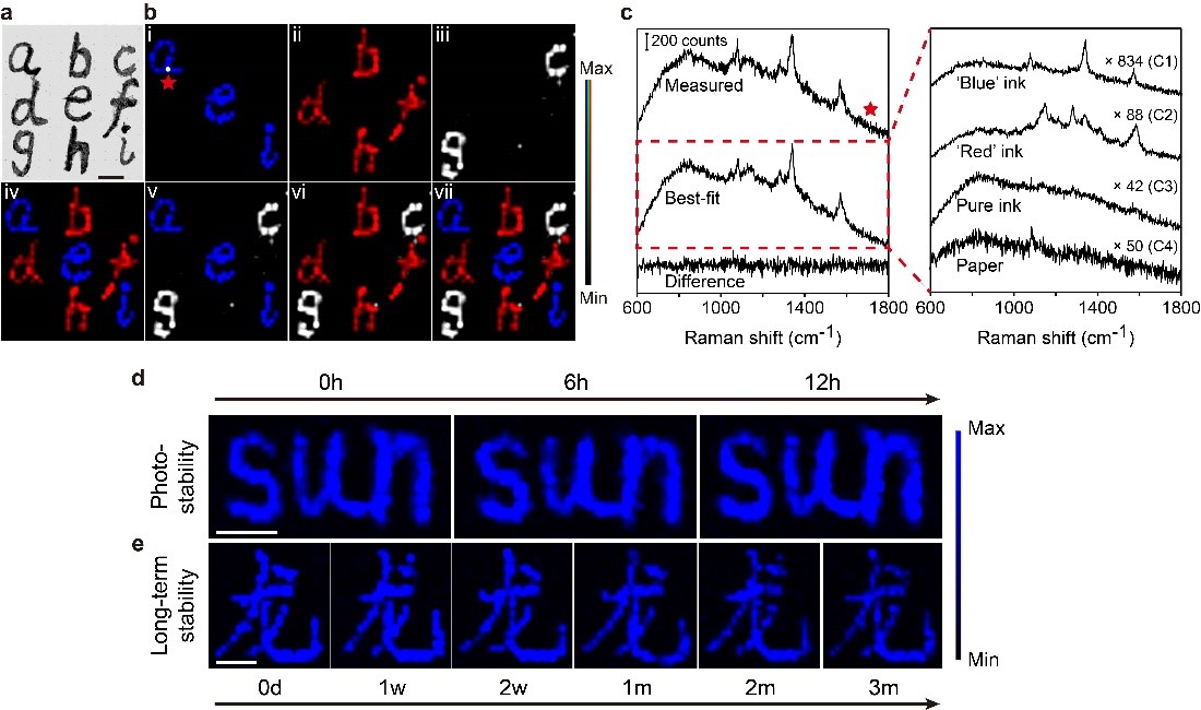 广泛使用的一种隐写术就是安全墨水,其中又以隐形墨水最为常见。这种墨水在自然条件下肉眼不可见,但借助热、水、光、特殊化学物质等显影手段能够显现出来。但是,传输完全空白的内容容易引起怀疑,导致信息不安全。一种解决办法是用特殊墨水书写信息,并藏于普通墨水书写的文本中。这样,自然条件下看到的是表面内容,只有借助某种显影手段才能看到真实信息。我们可以通过在普通墨水中掺入具有某种光学性质的纳米颗粒来制备特殊墨水,这样借助相应的成像手段就能将隐藏信息显影出来。表面增强拉曼(SERS)纳米颗粒由于特异性和灵敏度高、稳定性好、易于合成的特点,特别适合用于隐写术。与常见的荧光墨水相比,拉曼墨水光稳定性更好,且谱峰窄适于多指标,因此能够实现多色隐写。