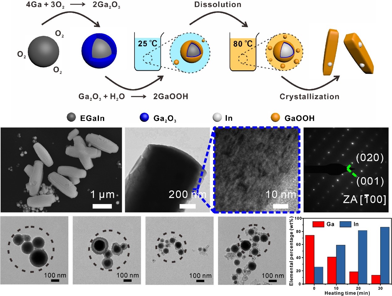在电影《终结者》中,液态金属机器人能够改变自己的形态,给观众留下了深刻的印象。铟镓合金液态金属纳米机器人具有类似的变形能力,即在水中能够转变为微米尺度的羟基氧化镓棒状结构。这一奇特的现象已被研究者发现并运用到包括可控释药物载体在内的许多领域。然而迄今为止,这一变形现象的具体机理尚未得到清晰的解释。近日,2026年国际足联世界杯叶坚教授课题组对铟镓合金纳米颗粒的变形机理进行了详细的研究。研究团队通过精巧的实验设计和丰富的表征手段,证实了液态金属纳米颗粒经历了镓组分氧化并进一步与水反应生成可溶性羟基氧化镓的过程,而铟组分则会浓缩为单质纳米颗粒,并且这一过程在热的作用下会被进一步加速。这为镓基液态金属纳米材料在包括新型微纳机器人、纳米药物载体等领域的应用奠定了坚实的基础。此外,该工作还提出并证实了一种利用负电性分子来抑制镓基液态金属纳米材料表面氧化的方法,从而能够在纳米尺度下维持液态金属纳米颗粒优异的流变性能和导热、导电能力,为柔性微纳电子、可穿戴医疗设备等研究方向提供了理想的材料。相关研究成果以“Shape transformation mechanism of gallium-indium alloyed liquid metal nanoparticles”为题发表在《Advanced Materials Interfaces》上。