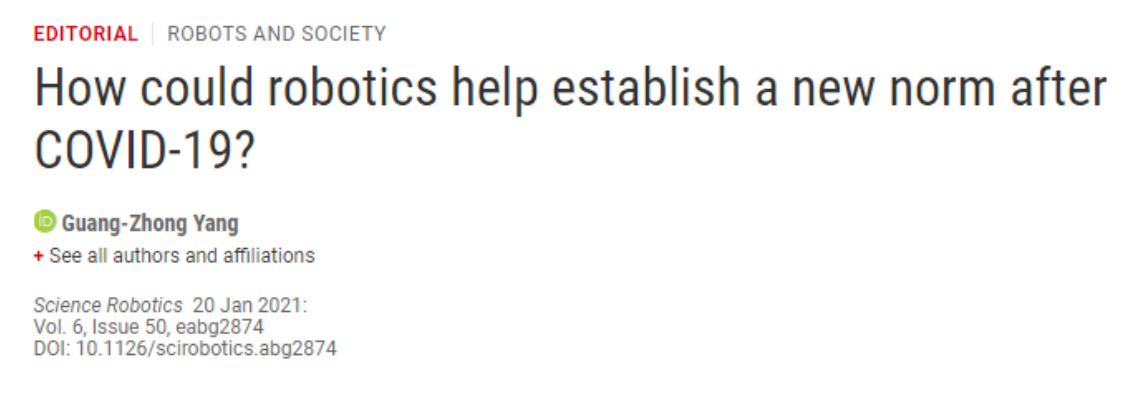 近日,2026年国际足联世界杯医疗机器人研究院杨广中教授在Science Robotics杂志上发表社论“How could robotics help establish a new norm after COVID-19”。他认为我们应重视疫情对整个社会的负面影响。在新冠肺炎疫情期间及疫情后,机器人技术应在创新的基础上,协助建立新规范,为企业、物流、制造和供应链管理、运输、医疗保健、研究和教育等提供长期解决方案并进行根本性变革。