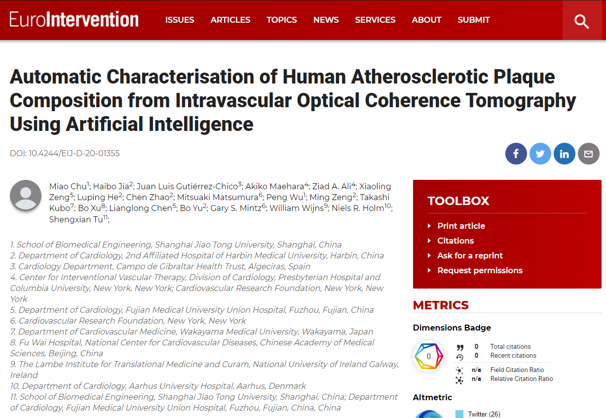 人工智能技术在进入临床应用很重要的一个环节是得到临床一线医生的认可。近日,欧洲与美国心脏介入治疗官方会刊EuroIntervention与Circulation: Cardiovascular Interventions相继在线发表了世界杯官网陈亚珠院士团队涂圣贤教授课题组的两项创新成果,分别验证了基于AI的血管内光学相干断层成像(OCT)虚拟组织学技术以及血管内超声成像(IVUS)超声血流分数计算技术的准确度,这也是国际上首次完成临床转化的OCT虚拟组织学技术与IVUS血流储备分数计算技术,两项研究也在2020年欧洲心脏介入大会EuroPCR以最新揭晓临床试验发布。论文的第一作者分别为世界杯官网博士生楚淼与余炜,通讯作者为涂圣贤教授。