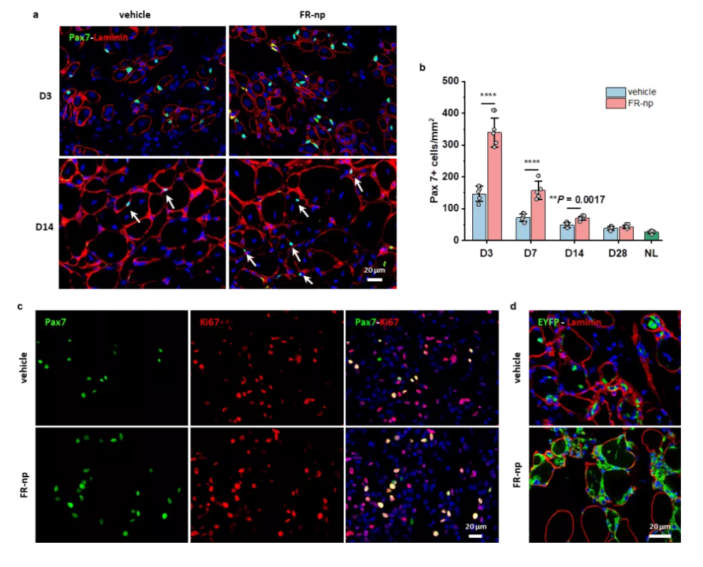 图4. 载小分子药物纳米颗粒促进原位肌肉干细胞