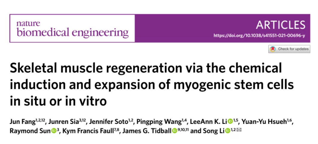 北京时间2021年3月19日凌晨,美国加州大学洛杉矶分校李松教授团队在国际顶级期刊Nature Biomedical Engineering在线发表题为“Skeletal muscle regeneration via the chemical induction and expansion of myogenic stem cells in situ or in vitro”的研究论文,方俊博士为本文共一作者。