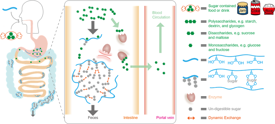 图1 药物机理示意图:聚合物结合糖分子,阻止糖分子的酶解和吸收,进而降低进食后的血糖升高。