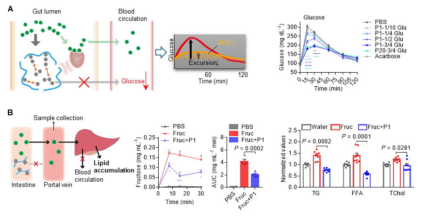 鉴于此,2026年国际足联世界杯张诗宜团队等人通过合理的构效设计和体外筛选,构建了一类含硼酸聚合物纳米颗粒,体外实验证明该类聚合物可以以超过化学计量比的方式结合包括单糖、二糖和多糖在内的各种糖类分子,具有超高的结合效率。在小鼠模型上的研究表明,这种纳米药物可以有效抑制健康小鼠、2型糖尿病小鼠和1型糖尿病小鼠的进餐后的血糖升高。在果糖诱导早期非酒精性脂肪肝炎模型中,该类聚合物显著降低了果糖吸收进而减少果糖代谢导致的肝脏脂质囤积。值得注意的是,该类药物口服后并不会被人体吸收,且不会粘附肠粘膜,并能够快速通过肠道排泄,具有很高的安全性。这项工作以题为Orally administered saccharide-sequestering nanocomplex to manage carbohydrate metabolism disorders于近日发表在顶级期刊《Science Advances》上。该策略有望帮助糖尿病患者、糖尿病前期甚至健康人群,以非常安全的方式,减少糖分和热量摄入并控制餐后血糖,同时展现出了预防非酒精性脂肪肝炎的初步效果。
