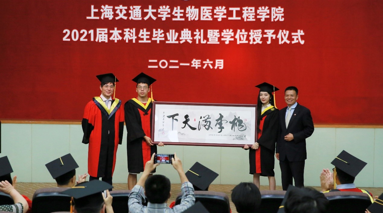 毕业之际,学院为同学们定制了一件印有姓名的学士服作为毕业礼物赠送给毕业生们。2021届全体本科毕业生心怀感恩之情,也准备了一份字画《桃李满天下》赠送给学院,感激学院栽培之恩,更是祝福学院桃李满天下,春晖遍四方。杨广中院长和季波书记代表学院接受礼物。