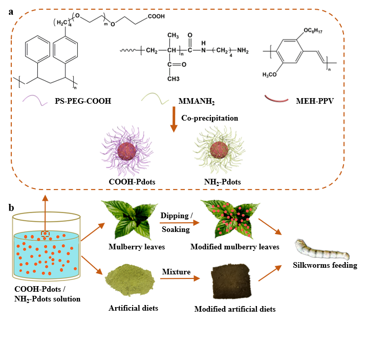 图1. a.共轭聚合物纳米探针的合成 b.添食法中桑叶及人工饲料的制备