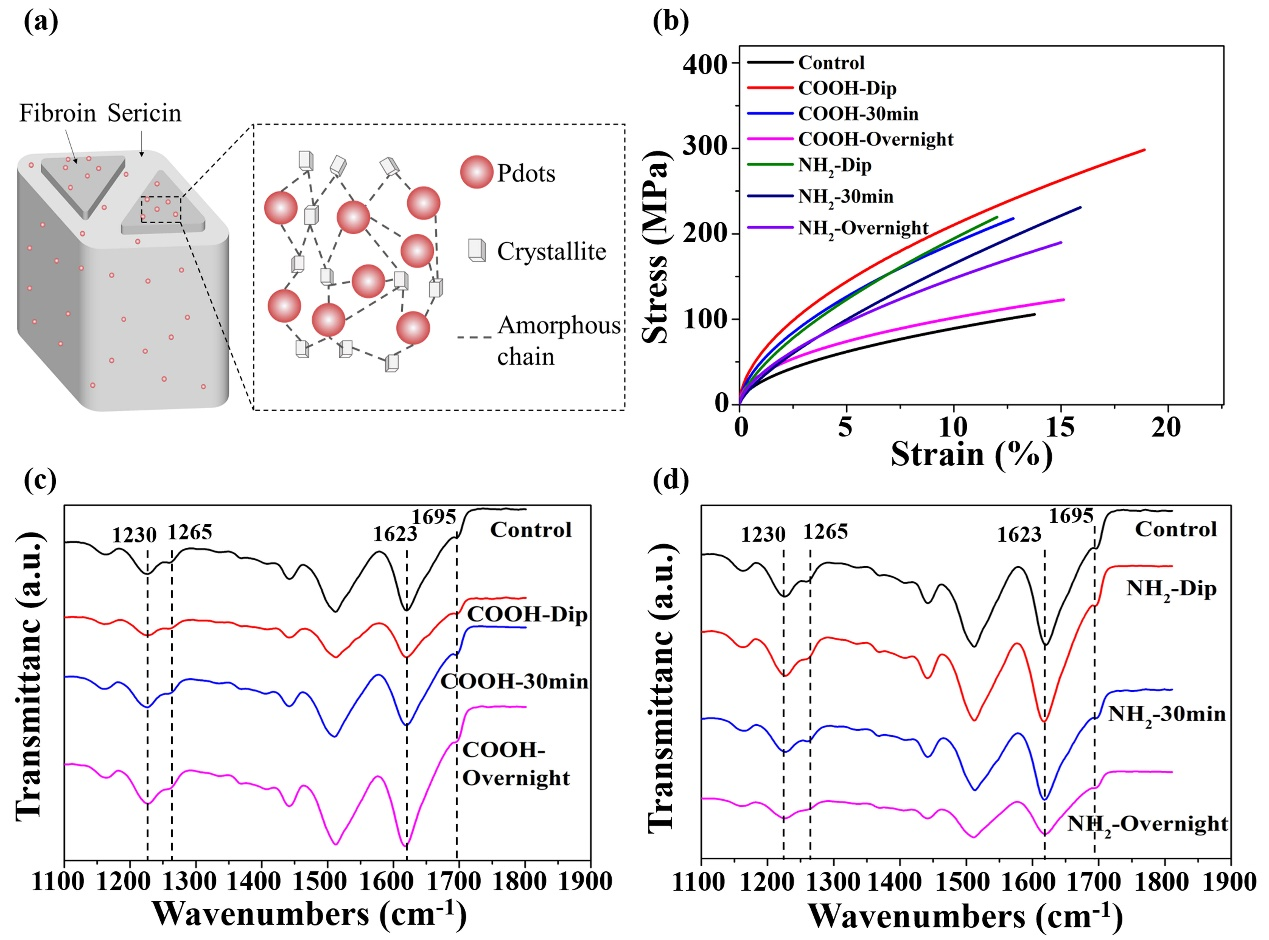 图3. a. 功能化蚕丝显微结构示意图 b. 功能化脱胶丝的力学性能 c-d. 脱胶丝红外光谱
