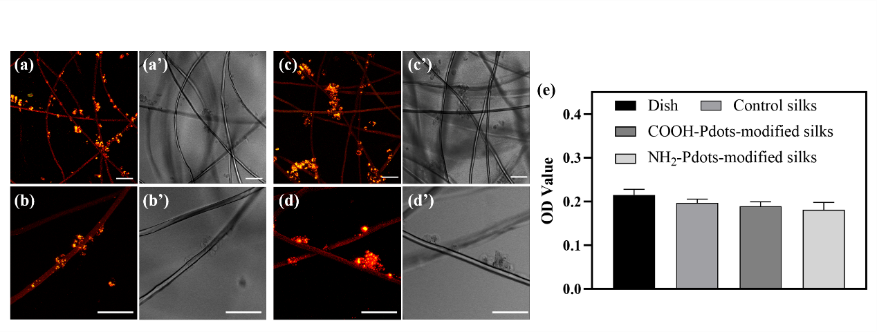 对蚕丝的二级结构进行分析发现Pdots利用自身的官能团与丝素蛋白作用,阻碍了丝素蛋白的构象从无规卷曲向β-折叠结构的转变,因此在丝素蛋白中β-折叠含量减少,无规则卷曲结构含量增加。与此同时Pdots作为如同β-折叠微晶一样的网络节点,增加了蚕丝蛋白内部“渔网”状网络结构的密度,从而更有效分散外力。相比于空白组的蚕丝,功能化后的蚕丝其断裂强度和断裂伸长率都有不同程度地增加(图3)。