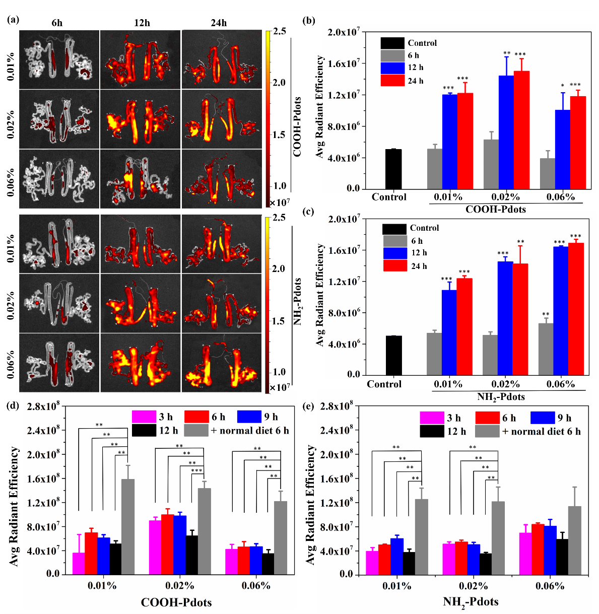 图5. a-c.共轭聚合物纳米探针不同时间点在家蚕丝腺中的分布情况d-e. 不同时间点家蚕排泄物荧光强度变化