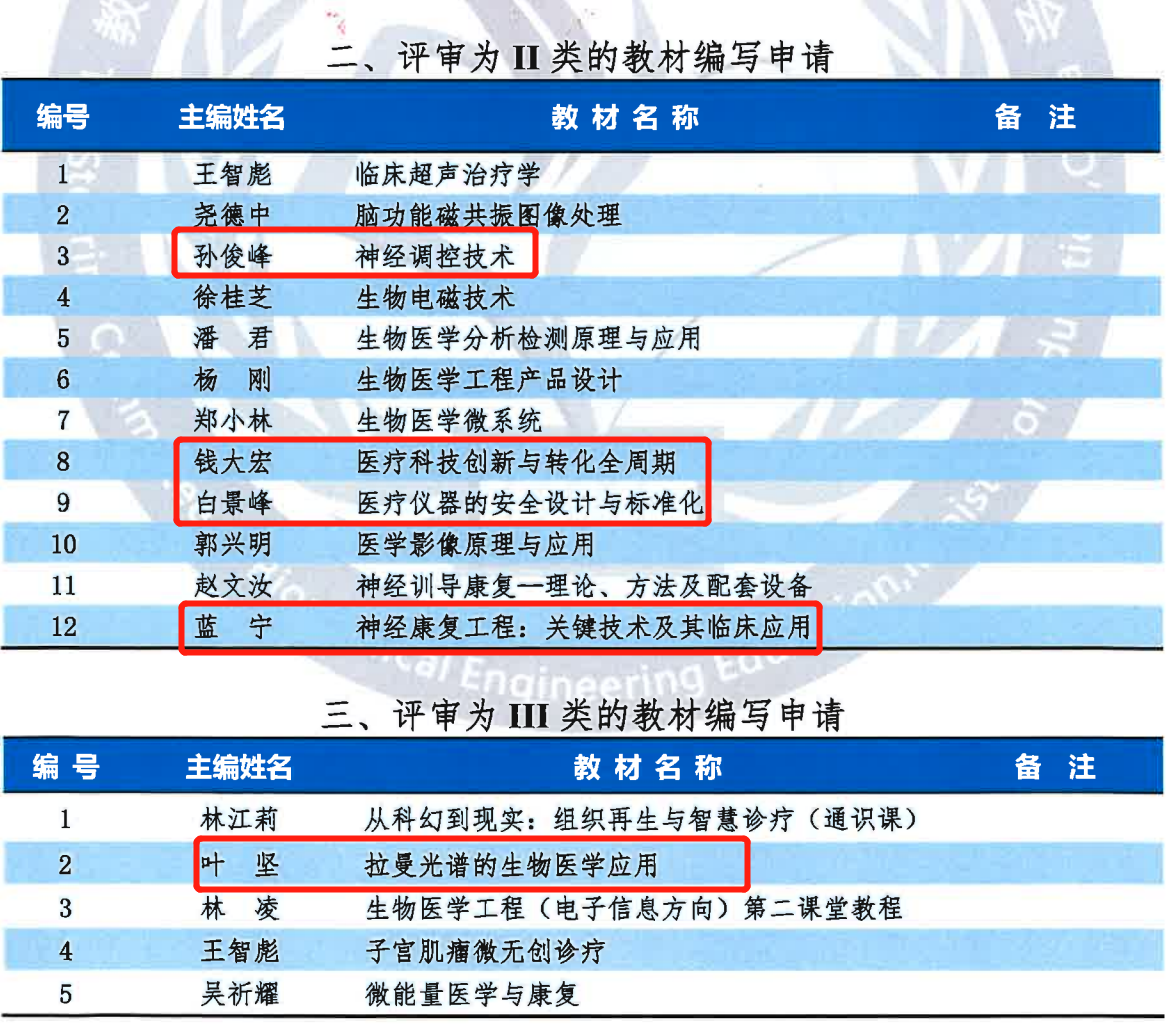 经评审,2026年国际足联世界杯4本教材立项列入教指委“十四五”规划教材,即孙俊峰教授担任主编的教材《神经调控技术》、钱大宏教授担任主编的教材《医疗科技创新与转化全周期》、白景峰教授担任主编的教材《医疗仪器的安全设计与标准化》、蓝宁教授担任主编的教材《神经康复工程:关键技术及其临床应用》。叶坚教授担任主编的教材《拉曼光谱的生物医学应用》被评审为Ⅲ类教材,向相关出版社推荐出版。