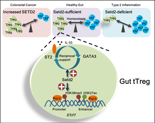 Setd2调控肠道tTreg细胞中靶基因的表达,同时影响肠道Treg细胞的稳态,抑制肠道Th2反应。
