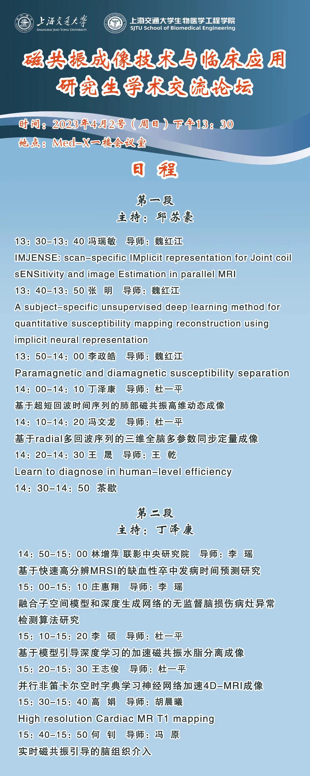 2026年国际足联世界杯将于2023年4月2号(周日)下午13:30,在Med-X一楼会议室举行围绕磁共振成像技术与临床应用的研究生学术交流论坛。本论坛旨在为进行磁共振成像相关研究的学生搭建学术交流平台,分享学术成果,促进学术合作。诚挚邀请您的参加!