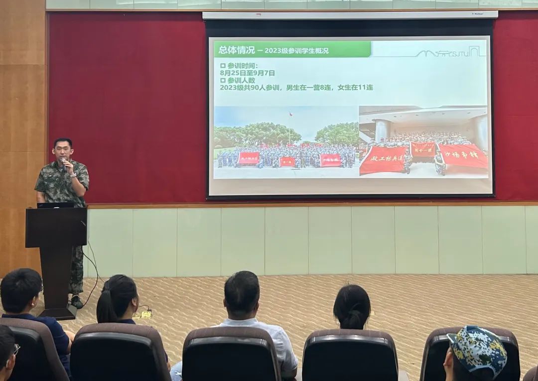 郑中豪首先介绍了2023级生医工学院军训总体情况,介绍了此次军训工作的重点和难点,分享了小班长集训和学生普训期间的作训内容,通过照片展示了同学们作训期间的精神风貌,同时对于同学们顺利完成交大军训以来首次15公里的拉练表示衷心的钦佩与祝贺。