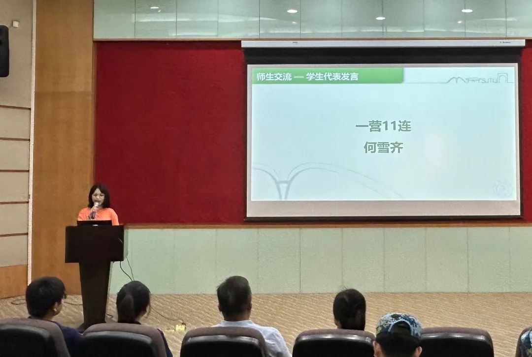 学生代表一营11连小班长何雪齐同学进行发言,分享她在军训期间的感悟。她谈到在小班长集训期间的苦与累将磨砺自己的品格,将训练的压力转化为驱动自己的动力。同时军训国防知识讲座也给自己留下了深刻的印象,无论在何时何地,希望的种子永远能够盛开在祖国的大地上!