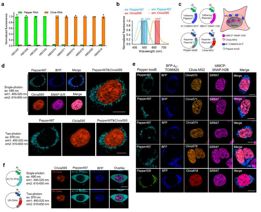 RNA拥有复杂的空间分布和动态轨迹,与多种生物分子存在相互作用,并通过这些相互作用发挥其功能。研究RNA功能通常需要将这些动态变化以及相互作用通过荧光信号进行动态显示,因此多目标分子同步的荧光成像,即多色成像,对于RNA研究尤为重要。从荧光染料设计的角度看,多色成像要求各染料分子的发射光谱完全分离,避免因光谱重叠带来信号干扰。然而,当前用于RNA成像的荧光染料大多处于蓝绿光区域,发射光谱严重重叠,无法满足多色成像的需求。解决问题的关键在于染料光谱设计:如何在有限的可见光光谱范围内布置多个发射光谱不重叠的荧光染料。考虑现有染料蓝绿光的发射光谱,设计染料的激发谱应当与现有染料重叠,而发射谱应尽可能红移以避免与现有染料谱图重叠。简而言之,需要增加染料的激发光谱和发射光谱间距(斯托克斯位移)。