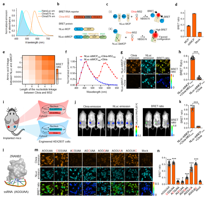 图3构建生物发光能量转移体系用于活细胞/活体中蛋白质和RNA相互作用的动态