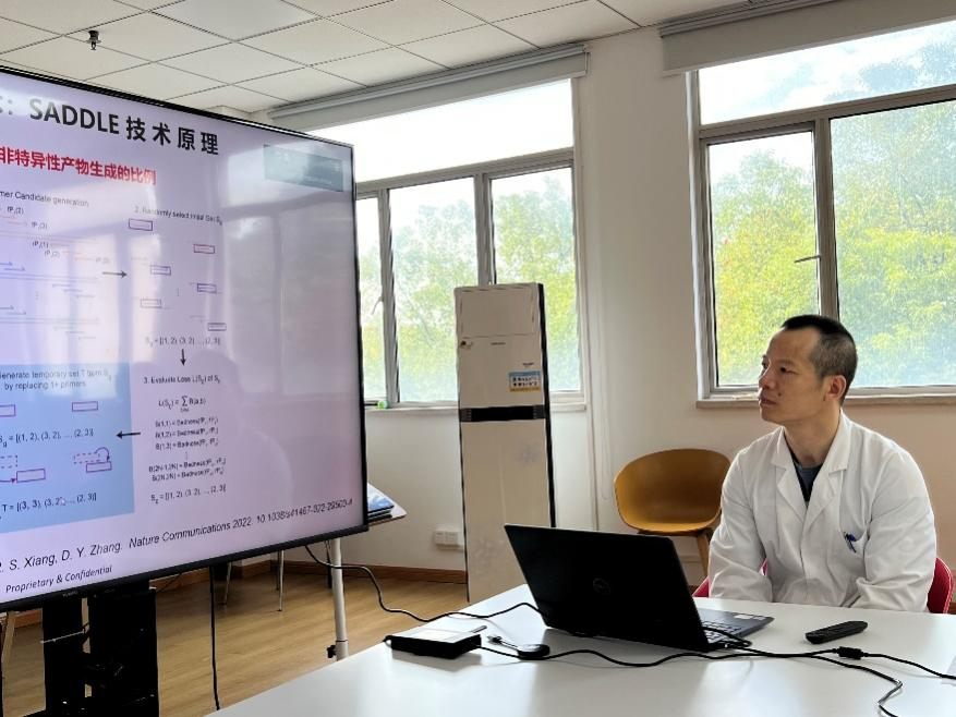 上海阅尔基因技术有限公司的联合创始人罗总深入讲解了课题“基于SADDLE技术的病原微生物的检测应用”,并介绍了公司近年来基于SADDLE平台在科研和转化上取得的成果,和学院李鑫辉老师进行了深度讨论。
