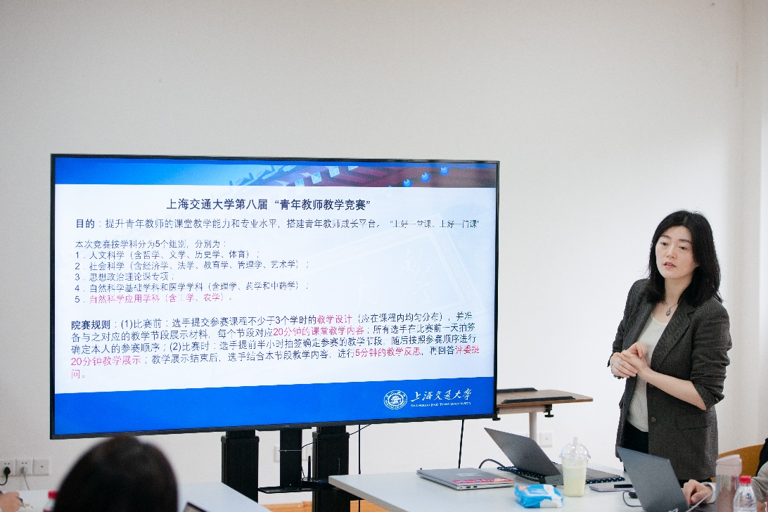 会议伊始,郭妍老师简单介绍了青教赛的目的、比赛规则等,根据往届的经验,梳理了十九条青教赛准备的注意事项,从多个维度为参赛教师提供赛前指导。