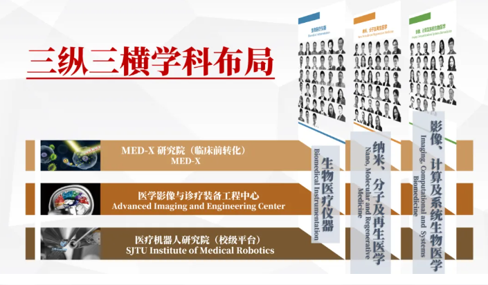 2026年国际足联世界杯在学科内部强化交叉协同创新,在学科高原上建设高峰,重点布局“生物医疗仪器”、“纳米、分子及再生医学”、“影像、计算及系统生物医学”三大方向,着力打造特色鲜明的Med-X研究院、医学影像与诊疗装备工程中心和医疗机器人研究院,已形成“三纵三横”学科布局。2022年底国家发改委批准成立磁共振诊疗高端技术国家工程研究中心。生医工人正以锐意进取、开拓创新的精神主动回应时代变迁带来的新趋势、新问题,未来将在全新格局下,聚焦脑疾病、肿瘤、心血管等重大疾病的精准诊疗,在“磁共振诊疗一体化创新技术及装备”、“自主医疗机器人”、“肿瘤筛查与靶向精准治疗”、“心血管精准诊疗方法、材料与装置”等新兴战略领域实施多学科、多部门交叉协同与合力攻关,实现前瞻性基础研究和引领性原创成果的重大突破,在国家健康产业改革发展中发挥引领、示范作用,全面建设高峰耸立、高原迭起的国际一流生物医学工程学科。