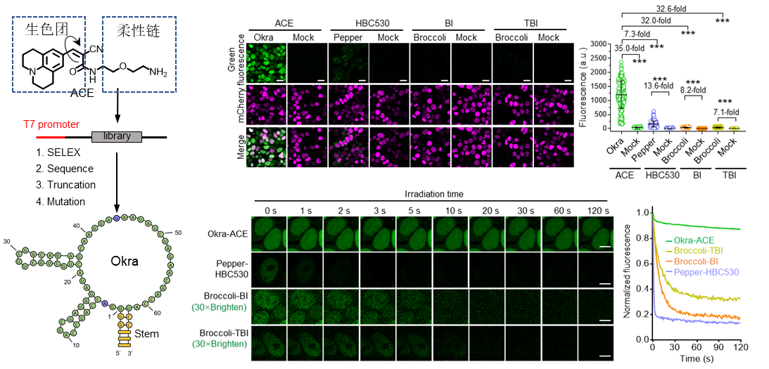 作为遗传物质的传递者,RNA复杂的生物学功能与生命健康息息相关,一旦其出现功能障碍,就会直接或间接导致许多疾病的发生。因此,为深入了解RNA的功能并阐明它们与疾病的关联,对其进行标记与成像已成为不可或缺的手段。在众多RNA标记与成像方法中,“荧光RNA技术”是近期发展的一种新技术:通过一段可基因编辑的RNA序列(RNA适配体)与目标RNA共表达,随后添加染料分子,使其与RNA适配体特异性结合并激活荧光,从而实现目标RNA的标记与成像。由于该方法具有操作简单、对靶标RNA干扰小以及信噪比高等优点,结合荧光染料种类多、光谱可调、光学性质优异等特点,因此在活细胞RNA成像与功能研究方面具有广阔的应用前景。尽管当前基于染料分子已经获得了系列多光谱的荧光RNA,但作为应用范围最广和仪器匹配度最高的绿色荧光RNA仍然存在细胞亮度低、光稳定性差的问题,限制了它们在活细胞中的应用。