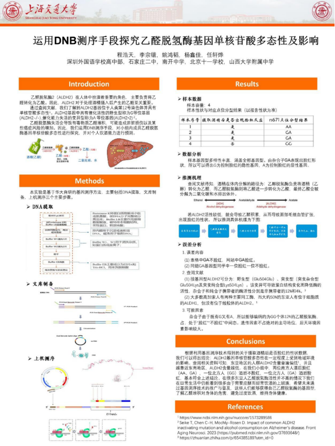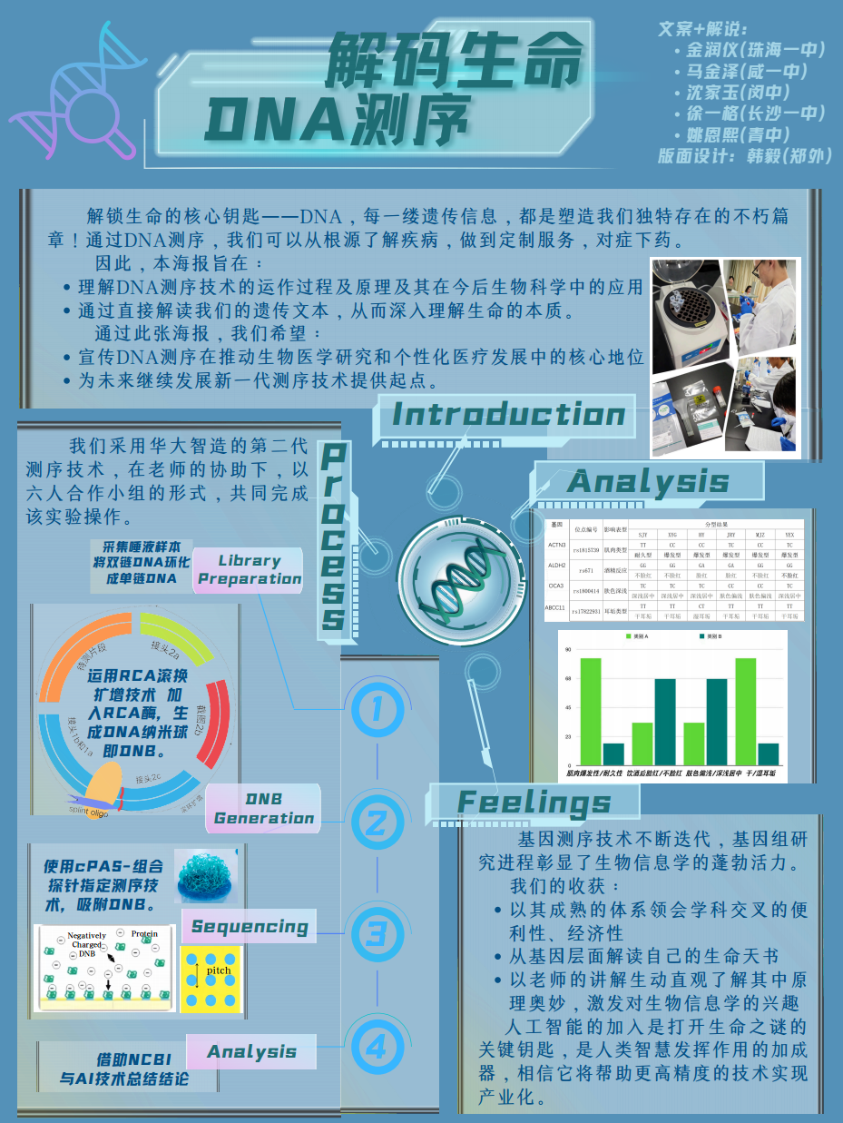 同学们采集自己的唾液,从中提取 DNA完成建库,并作成 DNB 纳米球,与其他样本混合后加载到测序仪上,完成测序实验。从测序仪上拷贝自己的测序数据,与参考序列进行比对,获取自己特定基因位点的变异信息,结合数据库和文献对自己的特定基因位点进行解读,预测该位点对自己先天性状的影响。经过不断的讨论与灵感碰撞,各小组分别选取自身兴趣点查阅资料,对一些特殊性状相关的基因进行深入思考和探究,并借助各种软件完成了海报的绘制,依次完成了分组成果汇报。其中,程浩天、杨鑫佳、李宗锴、姚鸿韬《运用DNB测序手段探究乙醛脱氢酶基因单核苷酸多态性及影响》与韩毅、沈家玉、金润仪、姚恩熙、徐一格、马金泽《解码生命——DNA测序》两个小组以极强的逻辑性和科学严谨性被评选为优秀作品参加了项目汇报成果展,并获得了众多同学和老师的喜爱。根据学生平时课堂表现和课程汇报,成筱楠、杨鑫佳、徐一格、丁典四位同学获评优秀营员。