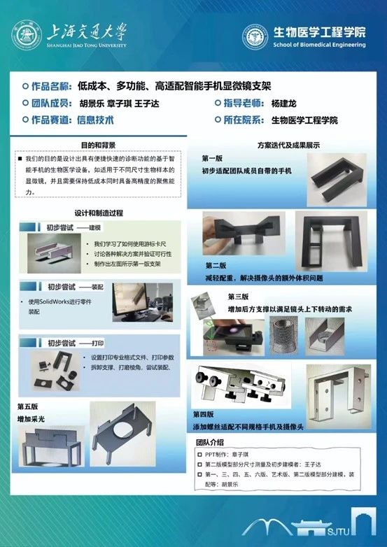 其中,由胡景乐、章子琪、王子达同学组成的小组“MADA”组设计的作品《低成本、多功能、高适配智能手机显微镜支架》,因其设计的创新性,结构的完整度以及表达的清晰性被评为优秀小组作品,向挑战营全营的同学汇报展示。此外,根据学生平时课堂表现和课程汇报,陆柯钢、常墨臻、孙浩然三位同学获评优秀营员。