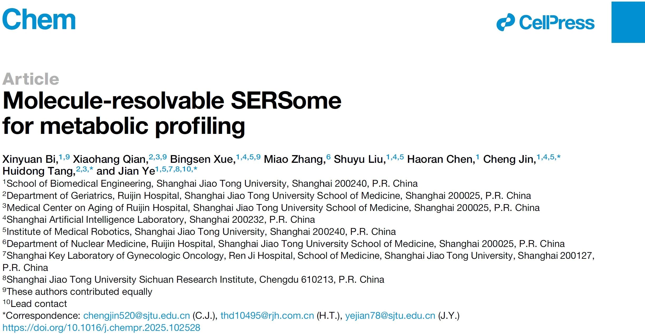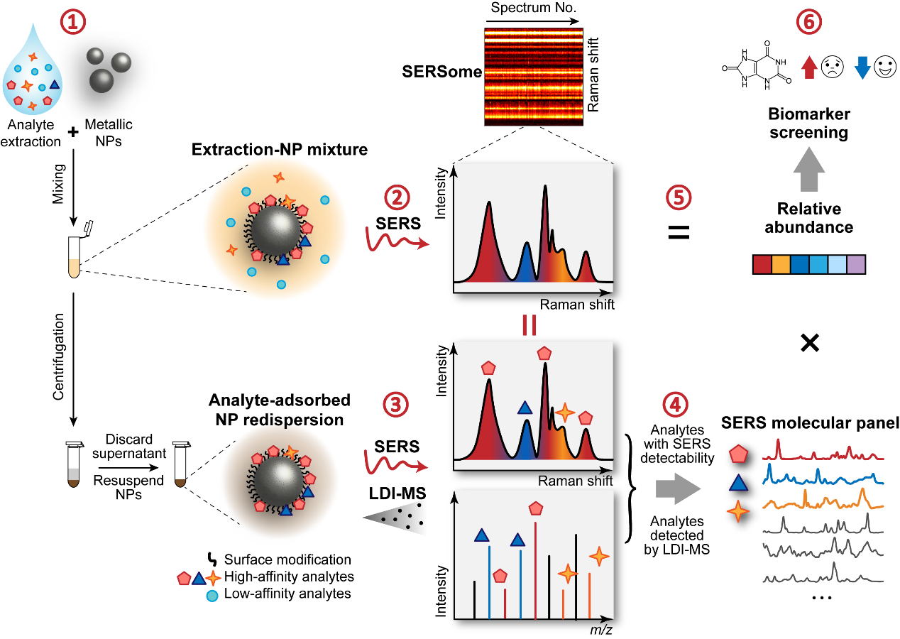 2025年4月4日国际顶级化学期刊Chem在线发表了题为“Molecule-resolvable SERSome for metabolic profiling”的研究论文。该研究针对非标记表面增强拉曼光谱难以实现多指标检测的挑战,提出了分子水平可解析的表面增强拉曼光谱分子组技术(Molecule-resolvable SERSome,MORE SERSome)。通过结合激光解吸/电离质谱与表面增强拉曼光谱,准确鉴定了对血清非标记表面增强拉曼光谱信号产生主要贡献的分子种类,并实现了具体分子的解析以及相对定量,为非标记表面增强拉曼光谱技术在代谢组学及其他领域的普遍应用奠定了重要基础。