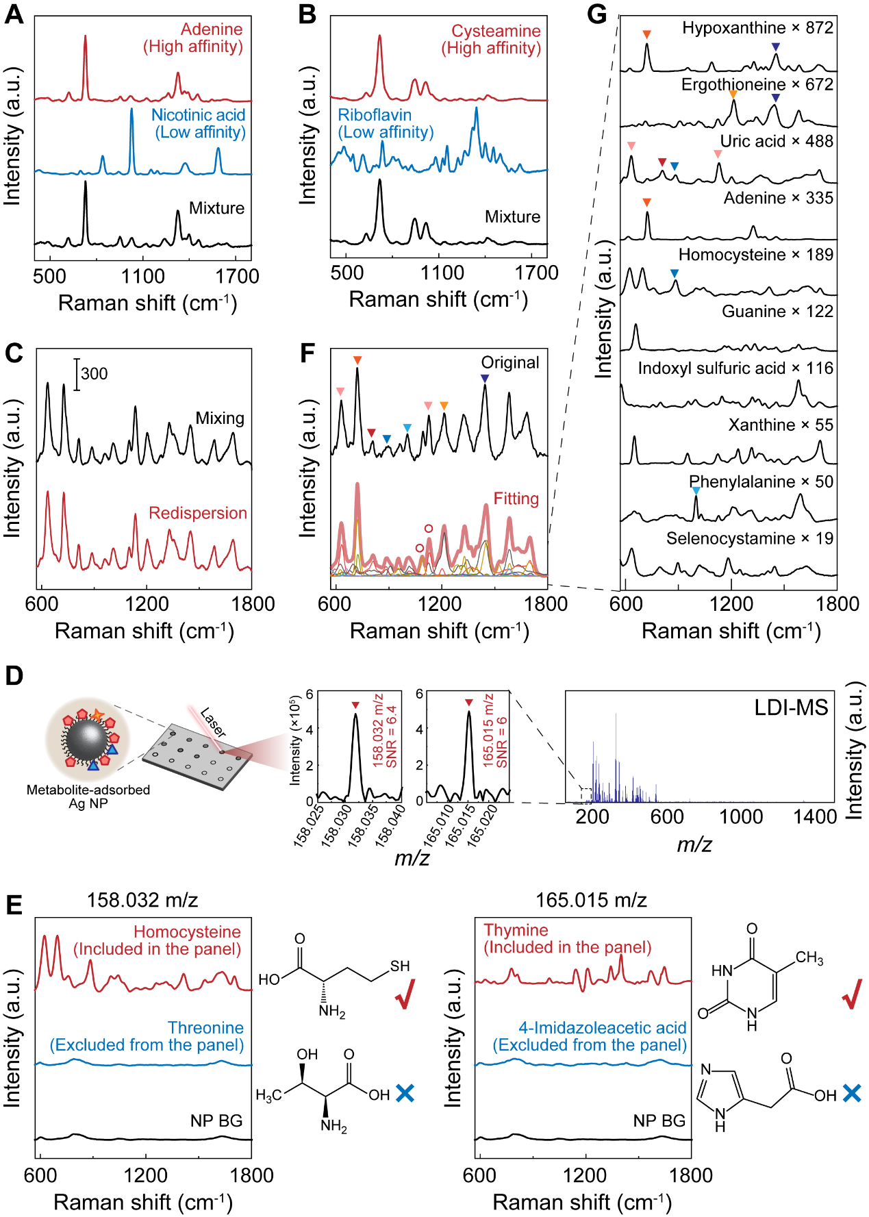 MORE SERSome技术以SERS纳米颗粒对于复杂样本中分子选择性富集与增强的天然特性为前提,主要鉴定颗粒表面所富集的血清代谢分子,因为这些分子最有可能贡献于血清非标记SERS图谱的谱峰特征。借助激光解吸/电离质谱技术,对颗粒表面所富集的血清代谢分子种类进行识别,并进一步判断这些分子在当前SERS检测条件下的被检出能力,最终建立了针对于人血清非标记SERS代谢图谱检测的目标代谢物组。采用这些分子的标准SERS光谱,基于非负最小二乘法可以实现原血清非标记SERS代谢图谱的解混,所获得的代谢物光谱贡献值可以用于反映不同样本间的相对浓度差异(图2)。