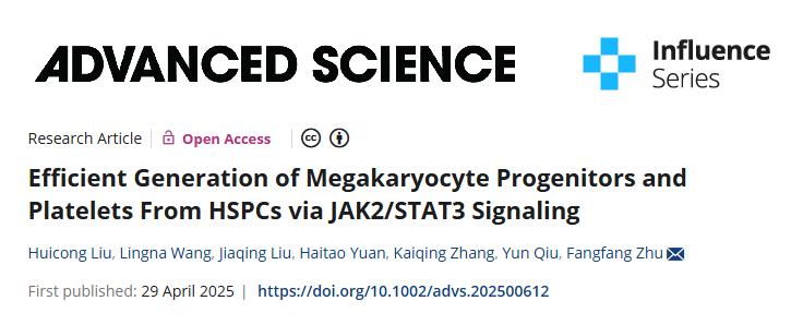 Liu H, Wang L, Liu J, Yuan H, Zhang K, Qiu Y, Zhu F. Efficient Generation of Megakaryocyte Progenitors and Platelets from HSPCs via JAK2/STAT3 Signaling [J]. Adv Sci, 2025, 29:e2500612.