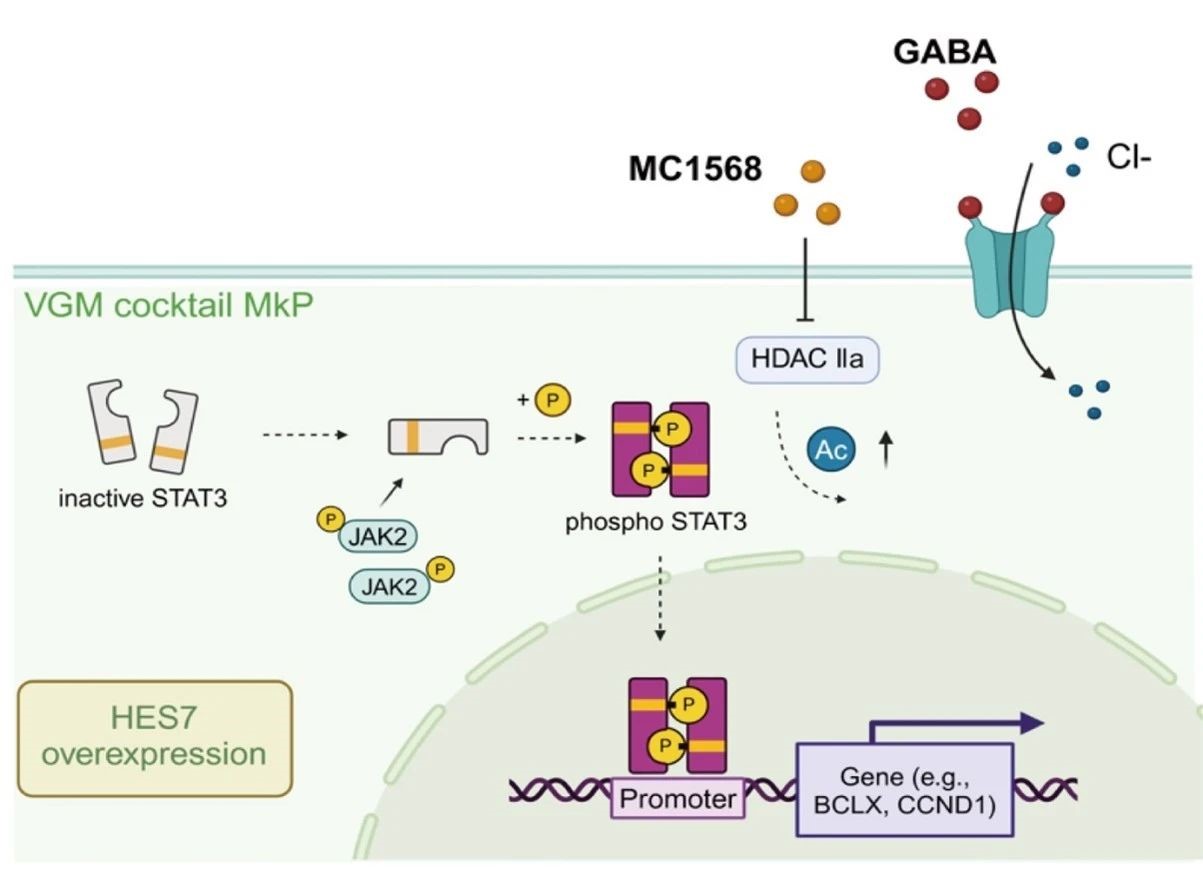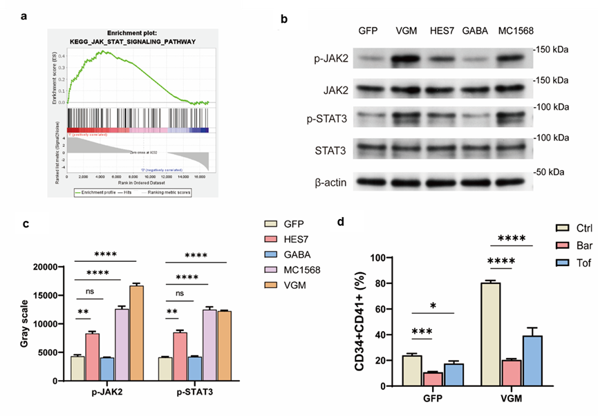 为了深入理解VGM-cocktail的作用机制,研究人员对VGM诱导的MkPs进行了转录组分析。结果表明,VGM组合显著激活了JAK2/STAT3信号通路,这一通路在巨核细胞分化和血小板生成中起着至关重要的作用。通过进一步的实验验证,研究人员发现,抑制JAK2信号通路可以显著降低VGM诱导的MkPs分化效率,从而证实了JAK2/STAT3信号通路在VGM组合作用中的关键地位。