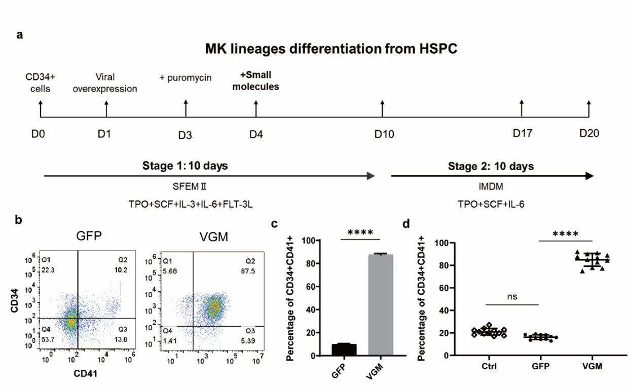 血小板是人体血液中的一种重要细胞,主要负责止血和凝血功能。在现代医学中,血小板的供应始终无法满足临床需求,尤其是在紧急输血和血液病治疗中。传统的血小板来源主要依赖于捐献,但这种方法存在诸多限制,例如供体短缺、质量不稳定以及潜在的传染病风险。因此,开发一种高效、稳定的体外血小板生产技术,成为了医学界亟待解决的难题。血小板由巨核细胞(Megakaryocytes, MKs)分化而来,而巨核细胞的前体细胞(Megakaryocyte Progenitors, MkPs)则是血小板生产的关键环节。然而,目前从造血干细胞(Hematopoietic Stem and Progenitor Cells, HSPCs)分化出巨核细胞和血小板的效率极低,难以满足临床紧急输血和血液病治疗的需求。