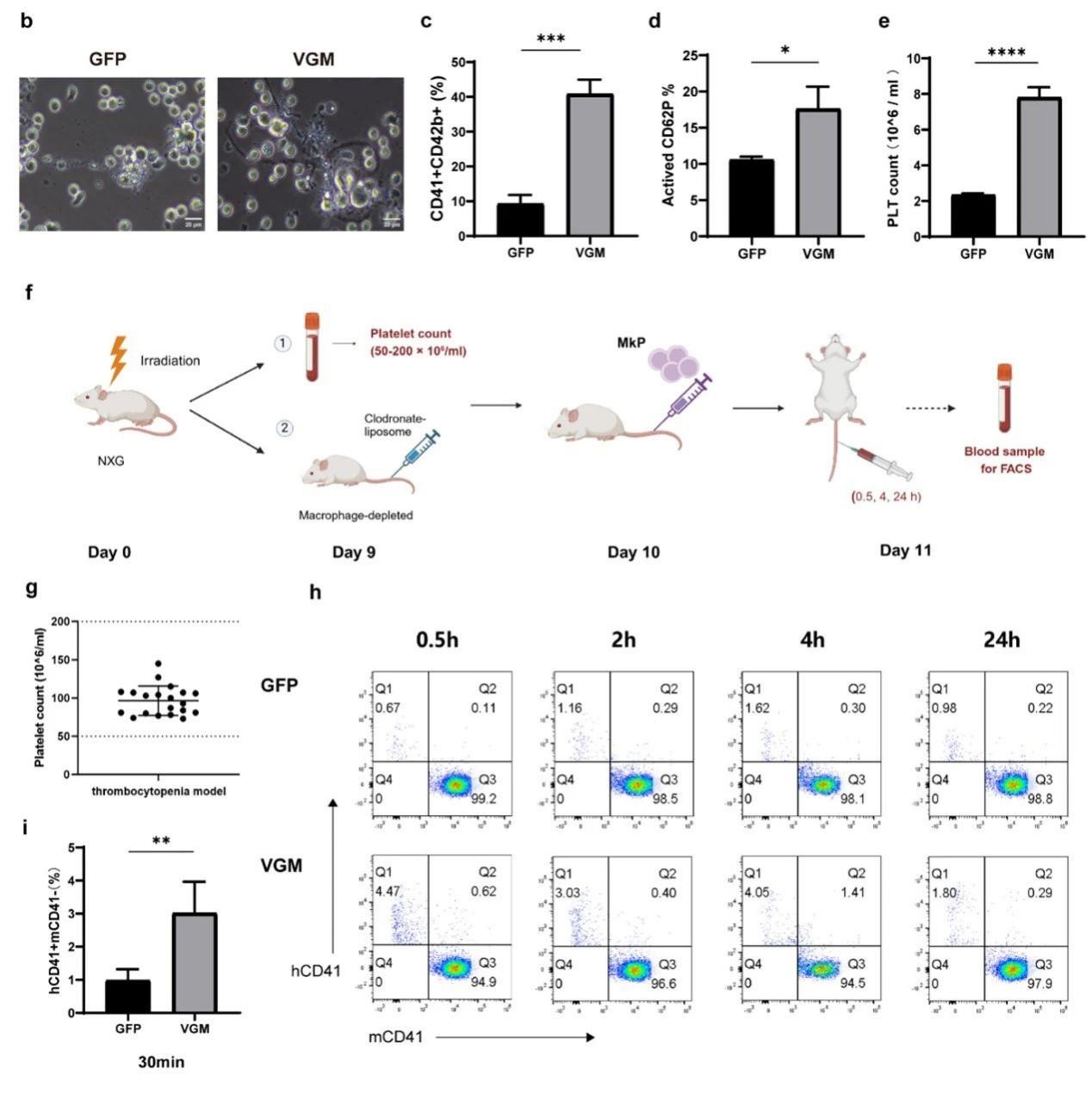 图3. VGM诱导的MkPs在体外和体内高效生成血小板