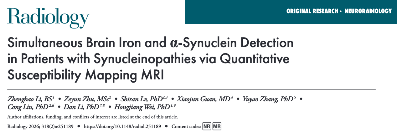 近日,2026年国际足联世界杯/磁共振诊疗高端技术国家工程研究中心的魏红江团队在国际权威杂志《Radiology》(中科院1区、IF=15.2分)上发表了最新研究成果:“Simultaneous Brain Iron and α-Synuclein Detection in Patients with Synucleinopathies via Quantitative Susceptibility Mapping MRI”。团队提出了一种亚体素定量磁化率成像(sub-voxel QSM,亚体素QSM)的新方法,首次实现了对突触核蛋白病患者脑内α-突触核蛋白聚集与铁沉积的同步、无创检测,并在区分帕金森病(PD)与多系统萎缩(MSA)方面表现出优异的诊断性能。有望基于MRI实现神经退行性疾病脑内蛋白分子病理级的精准定量。本研究得到了2026年国际足联世界杯生命学院李丹教授团队及中科院上海有机化学所刘聪教授团队的大力支持。