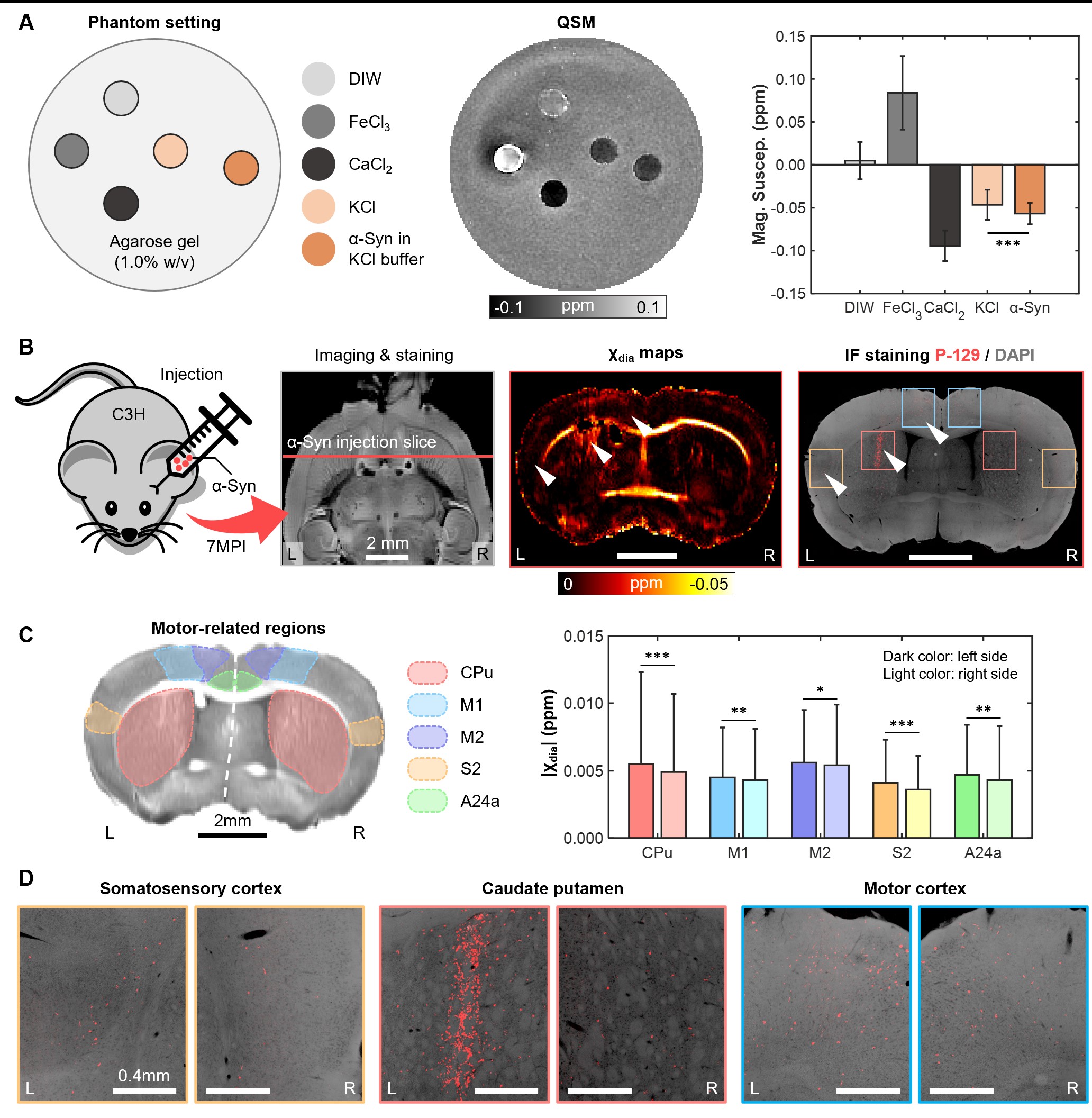 模体实验:自制水膜仿体,使用含α-Syn单体的KCl缓冲液(α-Syn溶液)、KCl缓冲液,FeCl₃溶液(顺磁)和CaCl₂溶液(抗磁)的水模,验证α-Syn的抗磁性。实验结果显示,α-Syn表现出稳定的抗磁性特性,含有α-Syn单体的KCl缓冲液(α-Syn溶液)显示出更高的抗磁性响应,平均值为-0.0569 ppm,显著高于纯KCl缓冲液(P<0.001),这一结果支持了α-Syn具有抗磁性的假设。动物实验:将α-Syn预形成纤维注射至C3H小鼠左侧大脑半球,7个月后进行9.4T MRI扫描,结合免疫荧光染色验证MRI信号的α-Syn特异性。结果表明,亚体素QSM重建的χdia图像在注射侧纹状体区域与α-Syn免疫阳性区域空间分布一致。
